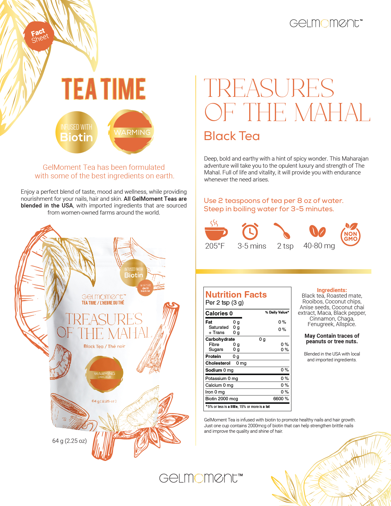 Black tea, roasted mate, rooibos, coconut chips, anise seeds, coconut chai extract, maca, black pepper, cinnamon, chaga, fenugreek, allspice.